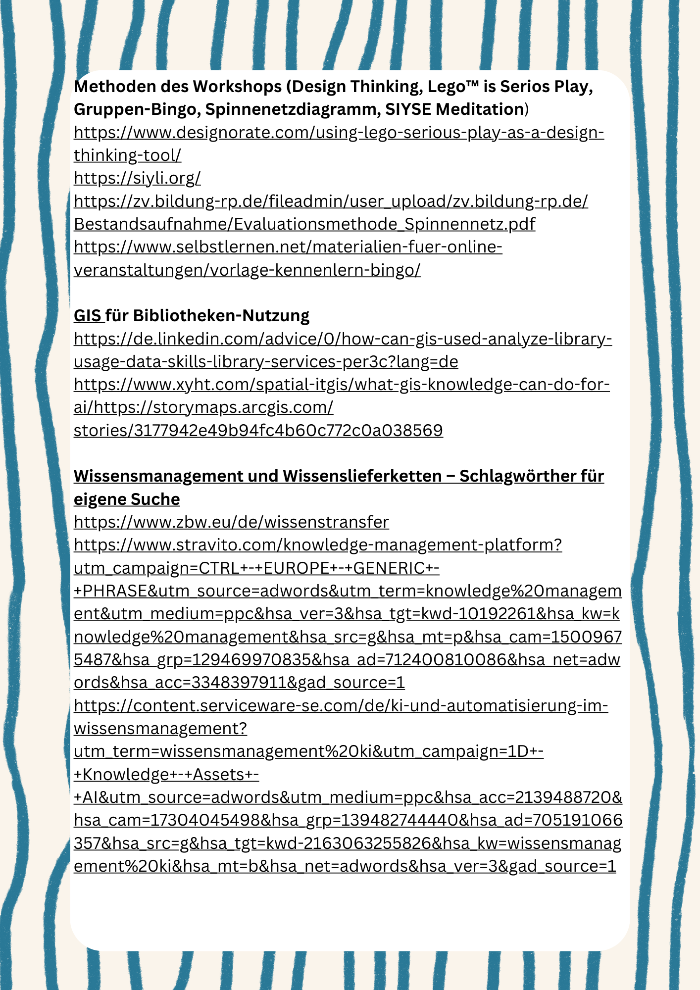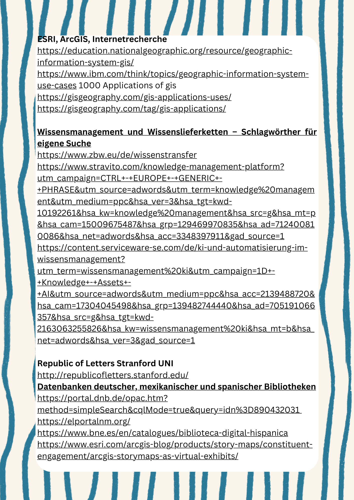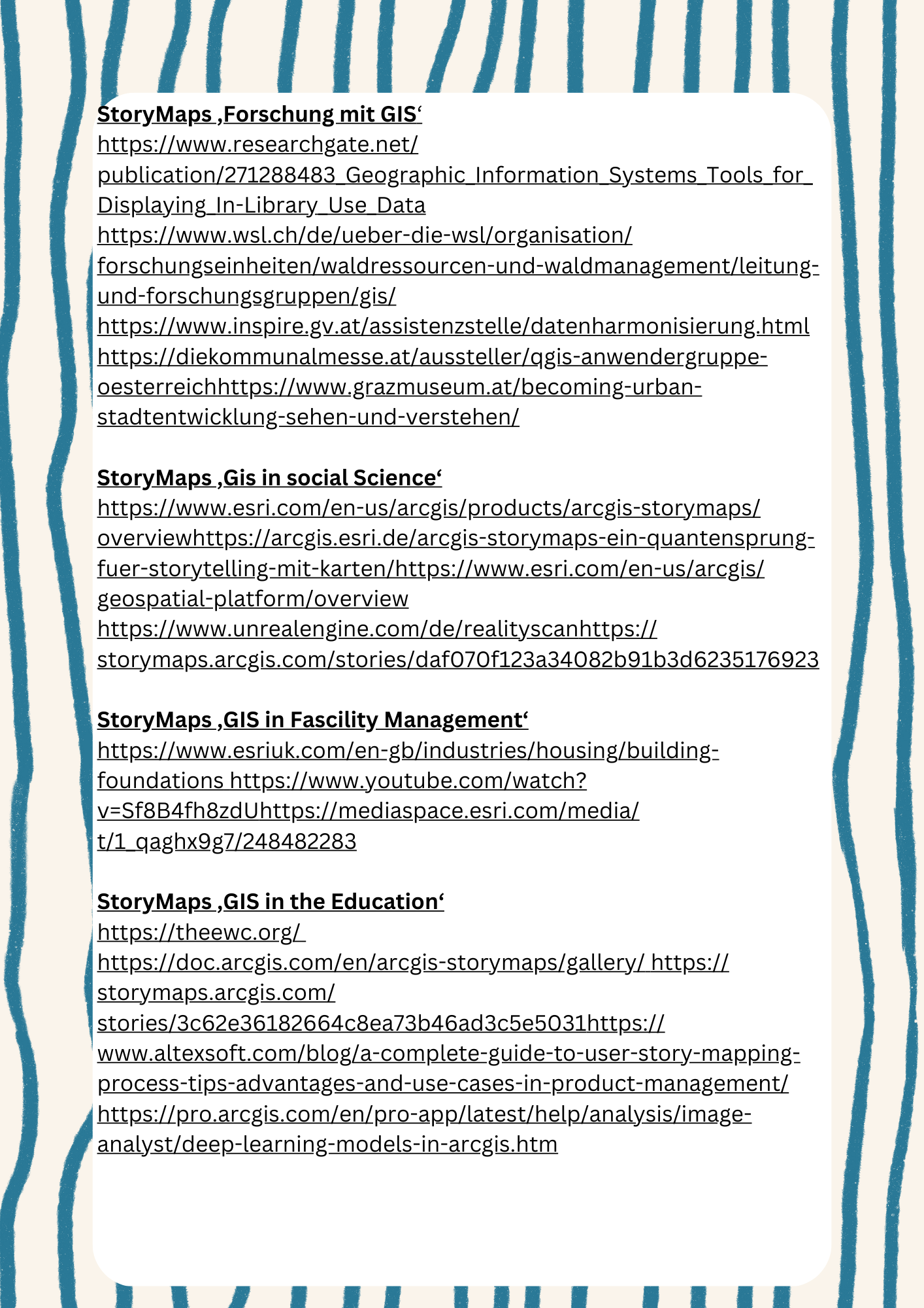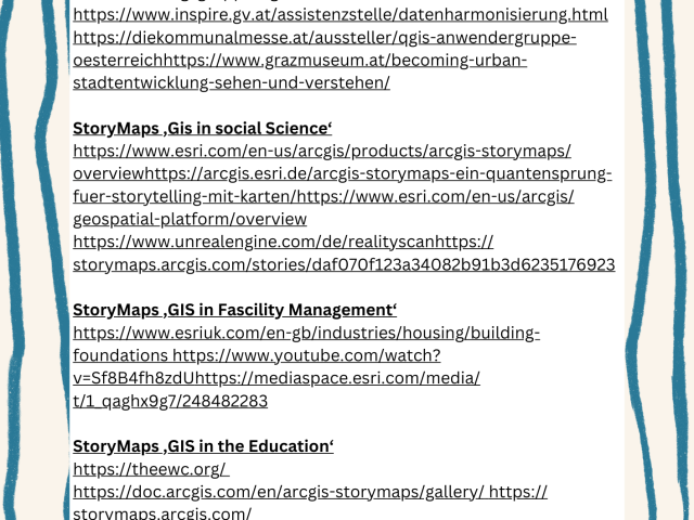 Ich habe mich bewusst entschieden, einen Leitfaden sowie die umfassenden Quellen, die ich bei der Vorbereitung des Workshops verwendet habe, bereitzustellen. Damit möchte ich es den Teilnehmer*innen ermöglichen, sich eigenständig Wissen in den Bereichen anzueignen, die sie persönlich spannend oder relevant finden. So können individuelle Interessen gefördert werden – ohne das klassische „Gießkannen-Prinzip“.  Hier ist der Link zur der GIS-Präsentation von ESRI - einem der führenden Anbietrn dieser Technologie. https://www.youtube.com/watch?v=Hau_ZCmN8eU